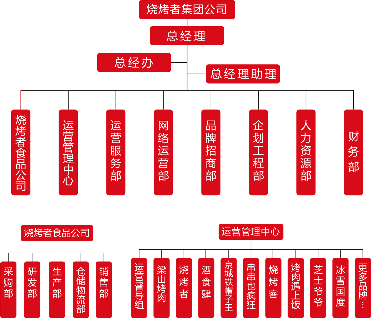 围绕烧烤终端用户的多样化诉求,烧烤者紧扣餐饮发展趋势,打造差异化竞品连锁。公司聚焦"餐饮+互联网"的品牌连锁战略,通过强大的O2O运营团队,成功孵化、运营了九大烧烤品牌:"梁山烤肉"、"烧烤者"、"酒食肆"、"京城铁帽子王"、"串串也疯狂"、"烧烤客"、"烤肉遇上饭"、"芝士爷爷"、"冰雪国度"等,广受用户好评。