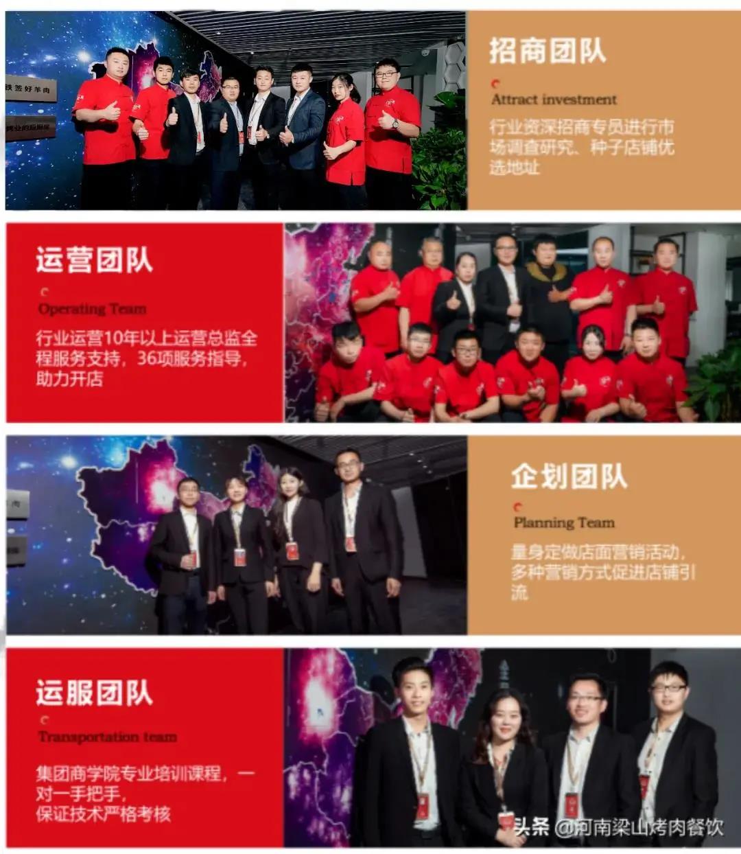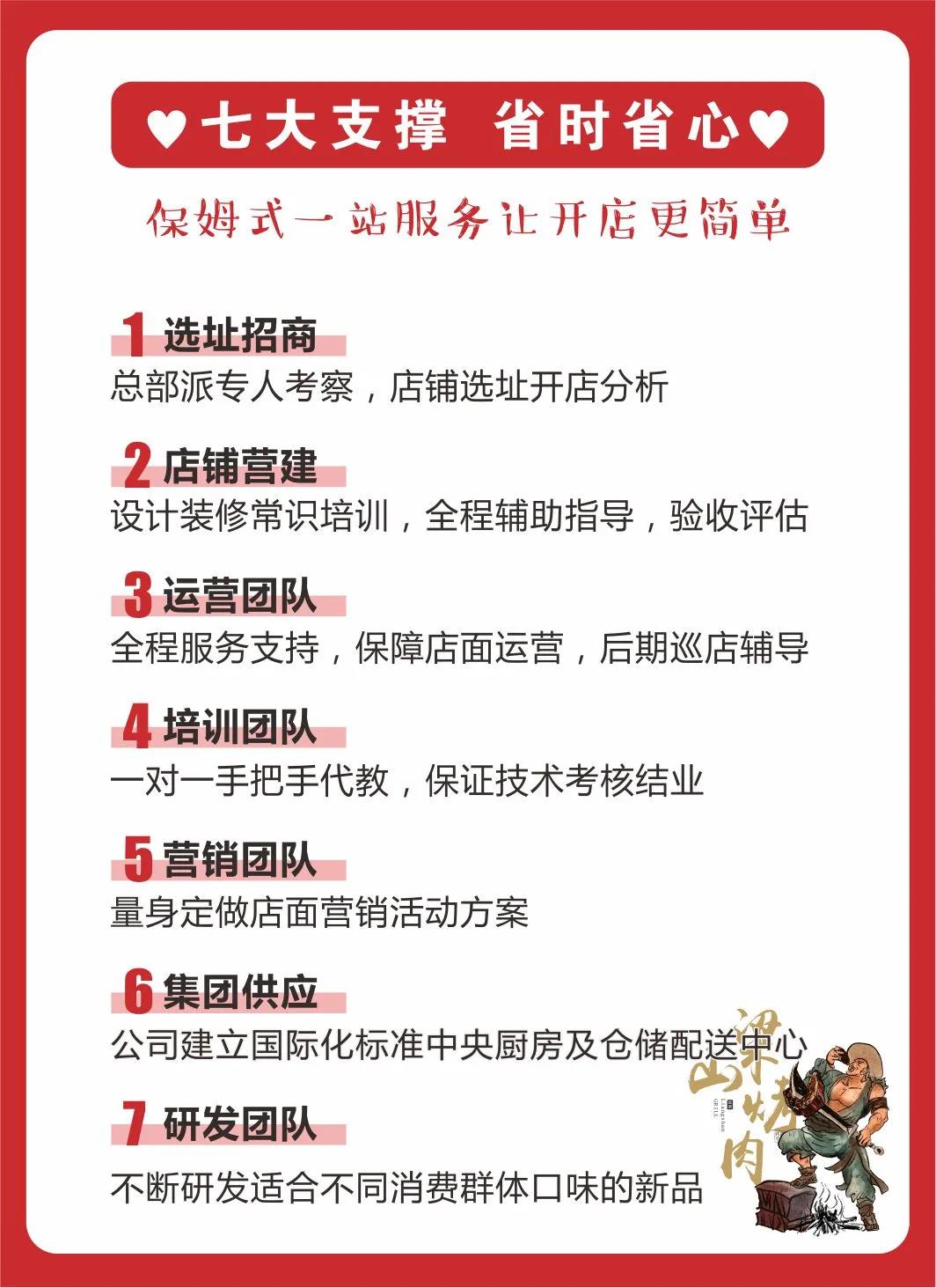 对于每一位选择梁山烤肉品牌的合作商,总部都将提供“保姆级”的创业扶持!六大金牌团队36项金牌服务,让您开店更轻松。