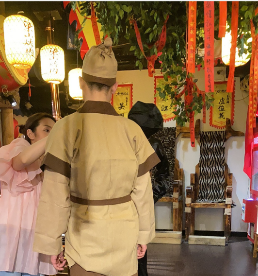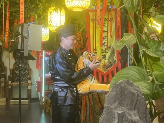 在梁山祈福树下上演了一场水浒传经典桥段“武松打虎”,节目组帅气的武松和Q萌的老虎,引来路人一一围观。美酒入肚,大战老虎,就差一顿围炉烤肉来解馋。“葡萄美酒夜光杯,欲饮琵琶马上催。醉卧沙场君莫笑,古来征战几人回。”在浓浓的江湖味儿里喝酒吃肉,尽显好汉们的豪气~虽然梁山烤肉门店环境非常有特色,但是“风格不是梁山的特色,味道才是!”梁山招牌菜品可是一吃就忘不了的味道!