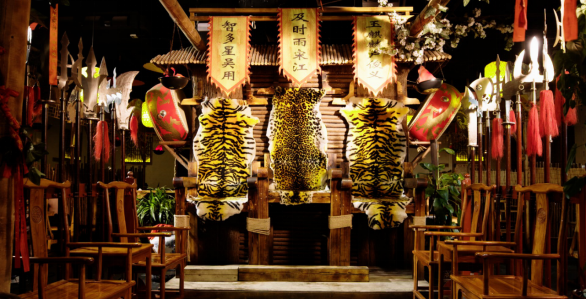 这家店位于丰庆路和南阳路交叉口,6点左右门外已经排满了等位的顾客,一进门店,就感受到一股浓浓的江湖气息。兵器架、祈福树、结拜厅、聚义堂,真是别有一番梁山风味。